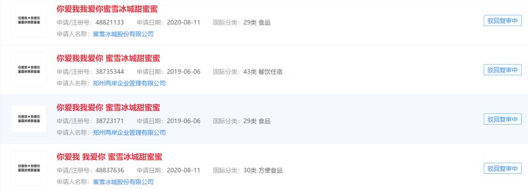 据内参君观察,前段时间,蜜雪冰城因主题曲火爆出圈,而这句“你爱我我爱你蜜雪冰城甜蜜蜜”,早在2019年6月被蜜雪冰城申请商标注册,虽然目前显示“驳回复审中”,但也可见蜜雪冰城在商标保护意识,恰有未雨绸缪之势。