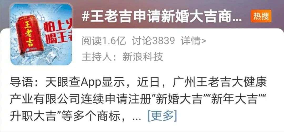 近期,“新婚大吉”、“开张大吉”、“杀青大吉”......王老吉申请多个商标冲上热搜。