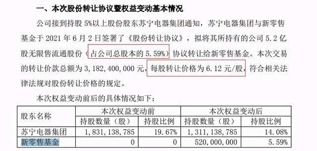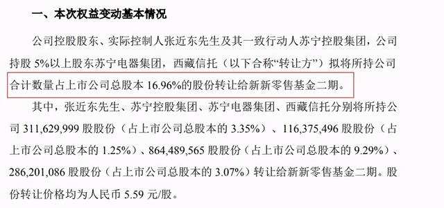 另一家则是到了7月5日才浮出水面,张近东及其行动一致人拟将所持16.96%的股份转让给江苏新新零售创新基金二期(有限合伙),转让总价约为88.27亿元。转让完成后,公司将处于无控股股东、无实控人状态。苏宁易购认为此次股份转让符合公司战略发展需要,对公司未来发展会产生积极影响。