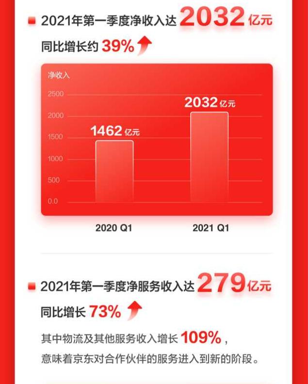 根据京东公布的2021年第一季度财报显示,京东的净收入为2032亿元,同比增长39%;服务收入为279亿元,同比增加73.1%;其中物流及其他服务收入为137.75亿元,同比增长超过109.19%;归属于普通股股东的净利润为36亿元,同比增加237%。京东旗下的京东健康、达达、京东物流的相继上市,也为京东提供了资本上的底气。