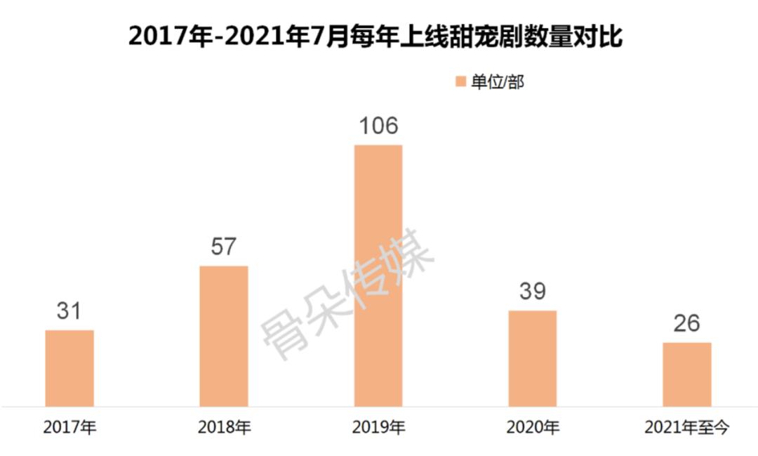 据统计,近5年甜宠剧的数量波动较大,从17年的31部、上涨到18年的57部、19年的106部,又随着市场饱和、观众审美疲劳缩减内容,到了2020年,正式上线的甜宠剧只有39部,而到2021年,上半年播出的甜宠剧便有26部,隐约又有提量之态。