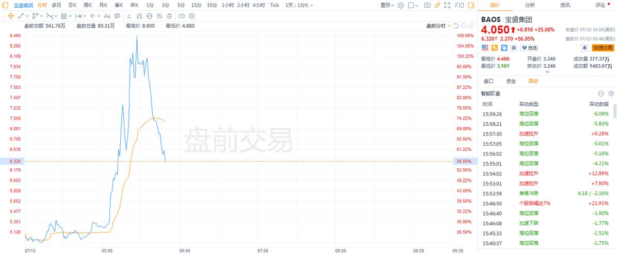7月13日,宝盛集团股票又一次进入大幅波动,盘前最高涨幅突破100%,但最终以12.1%跌幅收盘,交易换手率高达46.1%,与平常的交易态势相比,体现出强烈的操作性。