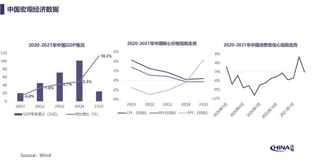 2020年国民经济运行稳定恢复,稳就业保民生成效显著,决战脱贫攻坚取得决定性胜利,“十三五”规划圆满收官,全面建成小康社会胜利在望。2020全年国内生产总值101.5万亿元,分季度看,一季度同比下降6.8%,二季度下降1.6%,三季度增长0.7%,四季度增长2.3%。同时国内CPI、RPI、PPI均受到疫情影响呈下滑趋势,但均在2021年上半年有所好转。截至2021年3月,CPI、RPI、PPI分别实现0.4%,-0.3%和4.4%。与此同时,信心指数在疫情之后也有所上升,截至2021年3月,消费者信心指数初步恢复到6.8%。