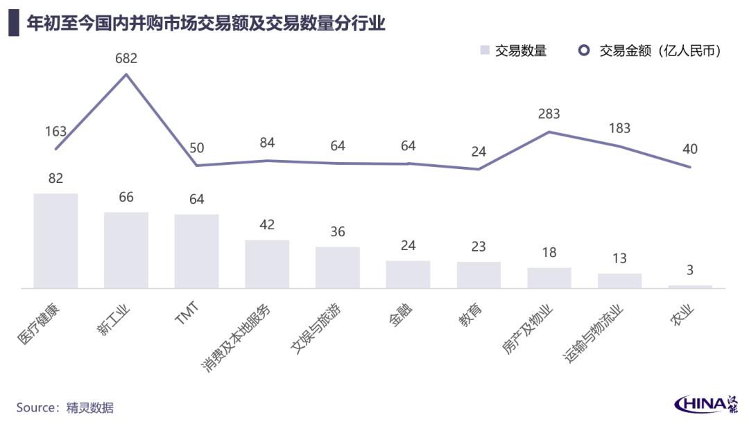 从年初至今国内已完成的并购交易数量来看,医疗健康、新工业、TMT、消费及本地服务领域的并购较为活跃;新工业、房产及物业、运输与物流业、医疗健康等行业的交易金额较大。