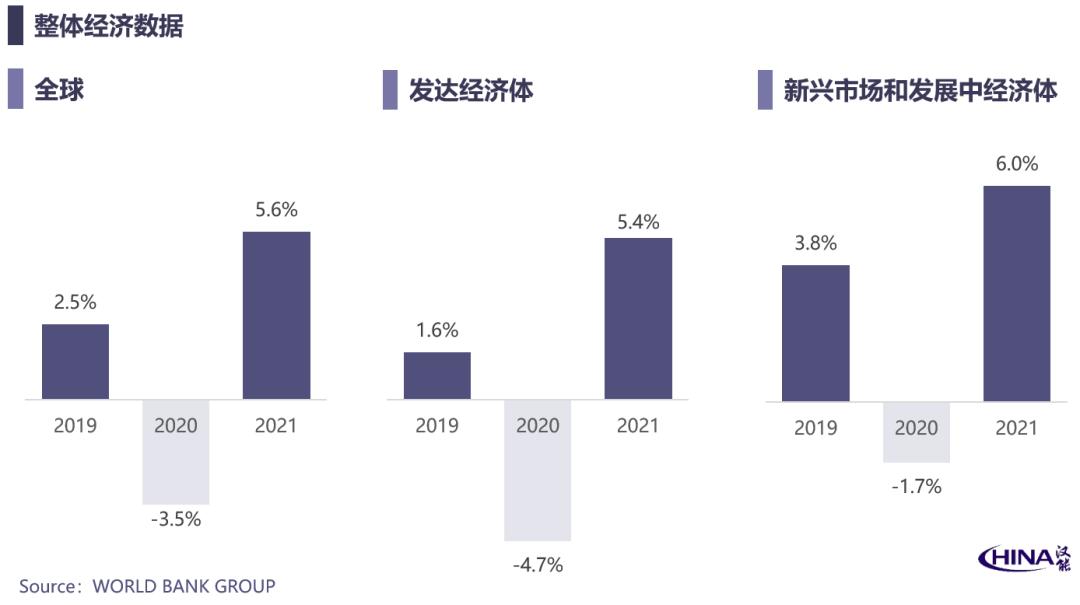 世界银行在2021年6月期《全球经济展望》报告中预测,2021年全球经济增长将达到5.6%左右,是近50年来最大增速,也是近80年来最大的衰退后增速。报告认为,短期来看,全球经济正从2020年的衰退中逐步复苏,新兴市场和发展中经济体面临的经济形势向好。报告预测中国2021年经济增速将达到8.5%,发达经济体增长预计为5.4%,新兴市场和发展中经济体增长预计为6%。