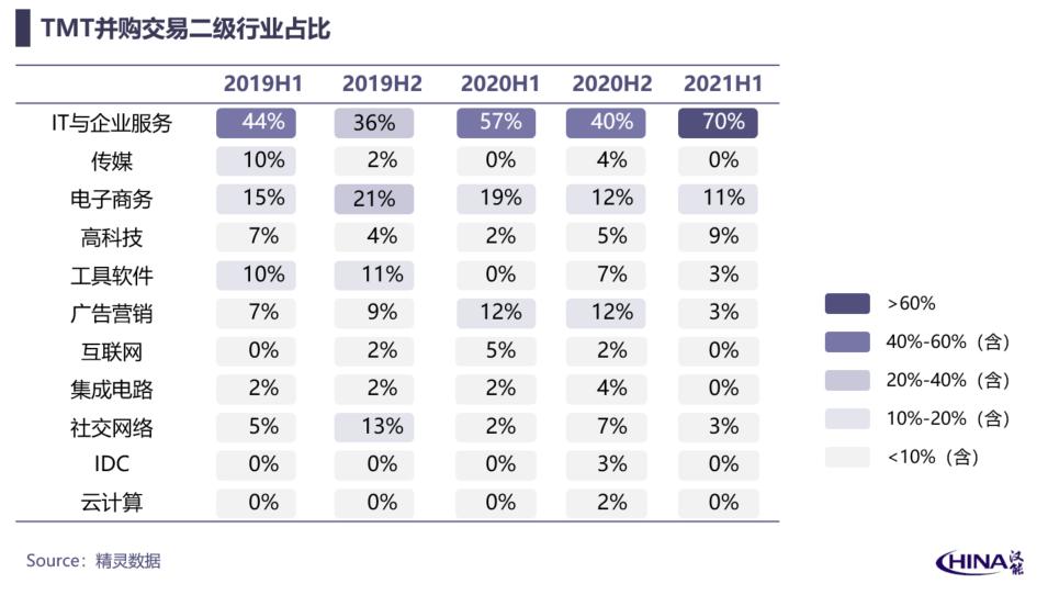 TMT并购交易中,IT与企业服务活跃度领先,2021年企业服务赛道热度维持高位,并购交易活跃。2019年开始,企业服务赛道成为TMT行业内并购最活跃的细分领域。2021年上半年,企业服务并购事件为45起,占据TMT行业并购事件70%。