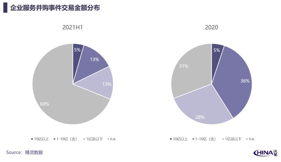 回顾企业服务赛道融资历史,2014-2015年起,企业服务热度显著上升,融资额逐年上涨;自2017年起,融资数量逐步下降,融资轮次逐步后移,并购交易数却持续上升。汉能分析,融资市场热钱消退,理性回归,企业服务赛道日趋成熟,市场加速出清。而从并购交易规模来看,1-10亿并购占比过半,由此可见“大鱼吃小鱼”的产业链纵深整合交易为当前企业服务赛道并购热点。