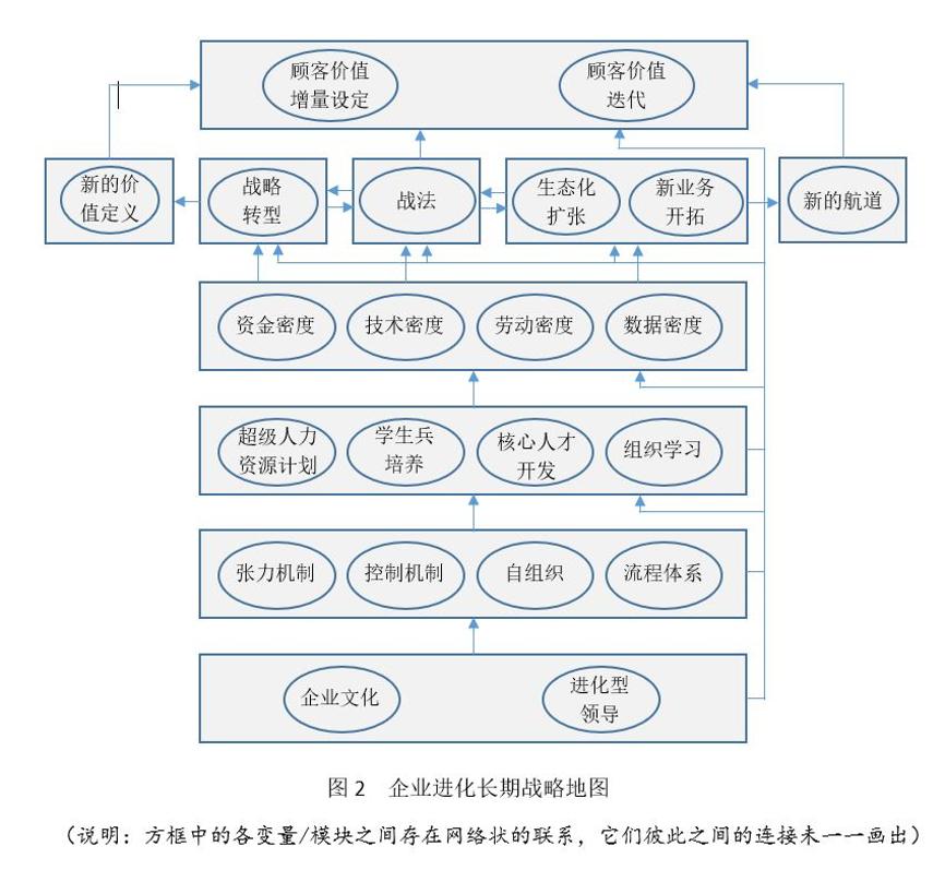 思考、解析这些背景,我梳理并构思了企业进化算法(图1)和长期战略地图(图2),试图为这些企业提供一个全局视野和系统思维。这套算法和地图适用于三大类企业:已经完成原始积累、超越创业期、找到自己主赛道的企业;技术追赶型的企业,它们有向能力型企业转型的驱动力;以及有长期战略意图、有产业思维的企业。