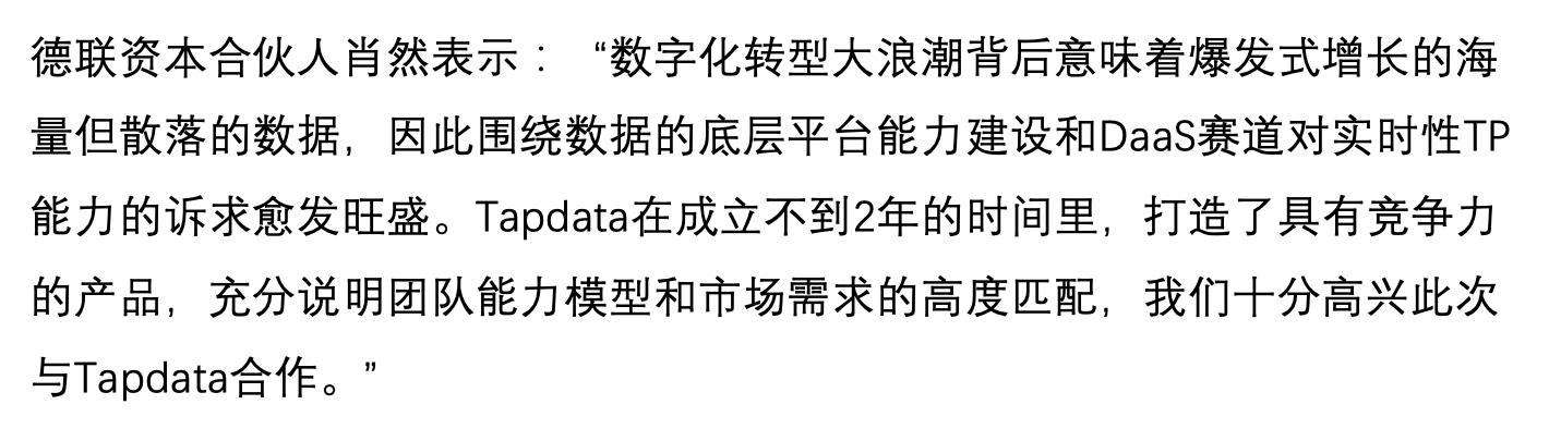 36氪获悉,面向企业 OLTP 业务的实时数据服务平台公司 「Tapdata」 (深圳钛铂数据有限公司,以下简称“Tapdata”),宣布完成来自五源资本独家领投的Pre-A 轮融资和来自XVC及德联资本联合领投的Pre-A+轮融资,投资金额达千万美金。元一资本连续担任两轮融资的独家财务顾问。两轮融资均将主要用于进一步的研发投入。此前,「Tapdata」曾获得来自变量资本和蓝海资本等天使机构联合投资近千万人民币天使融资。