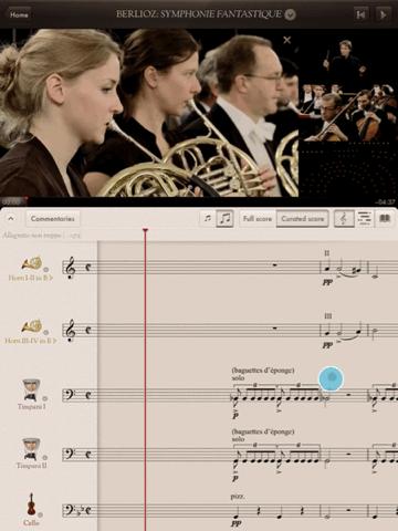 在第一部分的交响乐片段中点开一首,你会看到与演奏时间严密同步的乐谱,乐团的演出视频,还有开发者 Touch Press 引以为傲的 BeatMap 乐团演奏动态示意图,同时还有文字性的乐评。