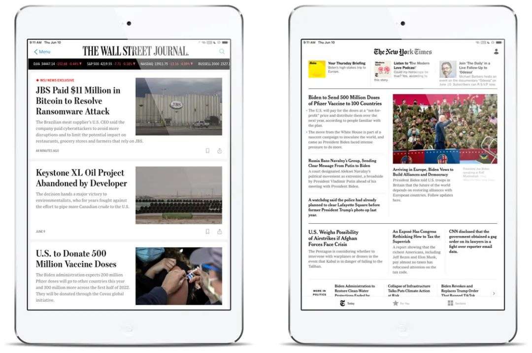 进一步,我们来举例子。对于能否有效利用屏幕空间的例子,我最想举的就是这个 WSJ 的客户端和 nytimes 客户端的区别: