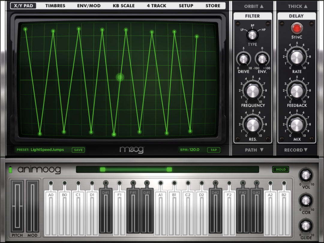 对于充分利用 iPad 灵活性的例子,我想举两个音乐 APP:KORG Module 和 Animoog。其实,它们从功能上讲有一定的区别。前者算是一个采样器(sampler),根据输入的按键输出事先录制好的声音;后者则是合成器(synthesizer),允许用户根据自己的需要调整参数来合成自己需要的音色并输出。但是如果音色已经准备就绪,那两个 APP 都可以当作现有的乐器来使用。