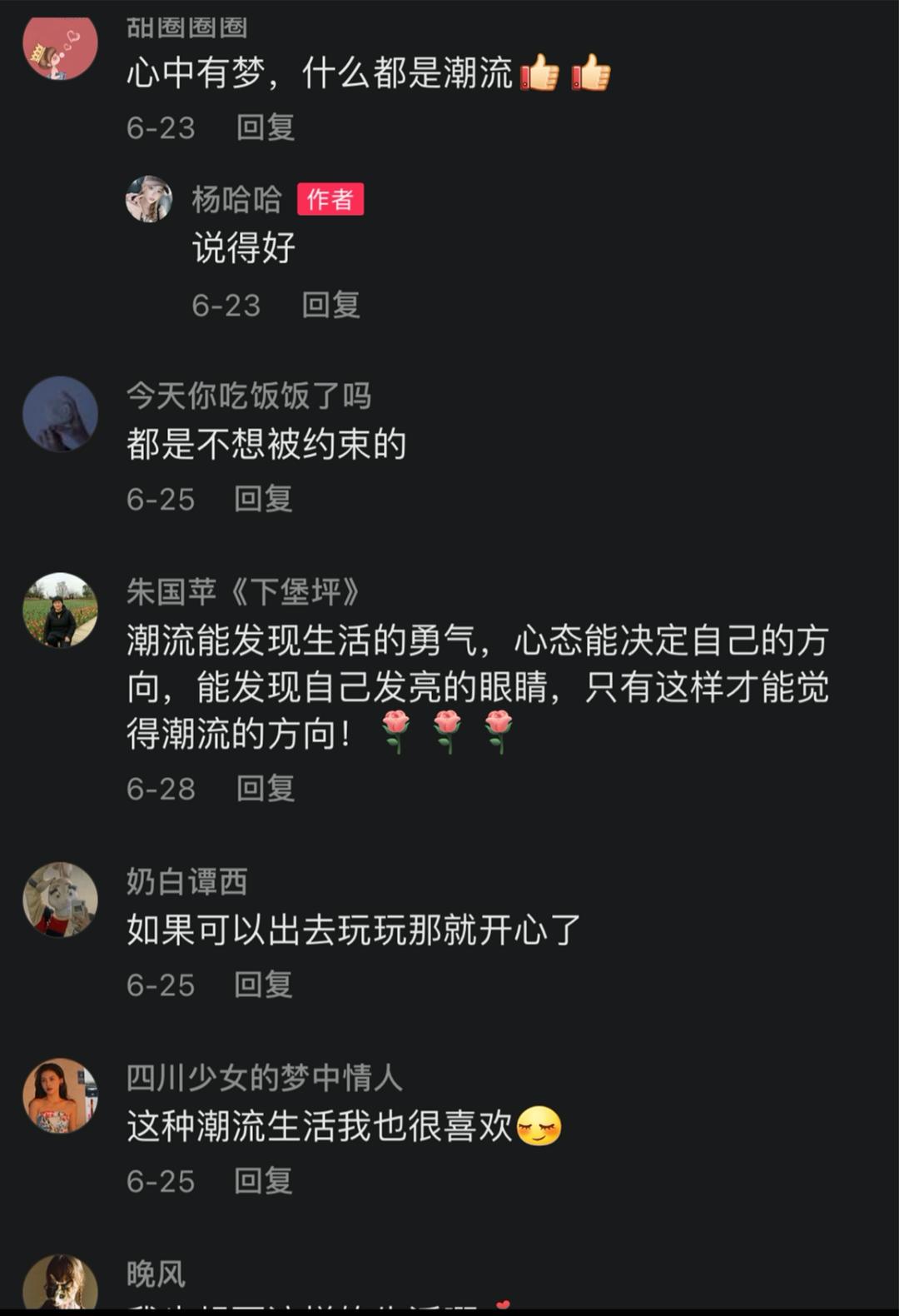 「心中有梦,什么都是潮流」、「说走就走太潮了」、「潮流是能发现生活的勇气。」……这一系列视频引发了超过130万条评论,没有尖酸刻薄的讽刺和无休止的争吵,只有来自内心的深度共鸣。