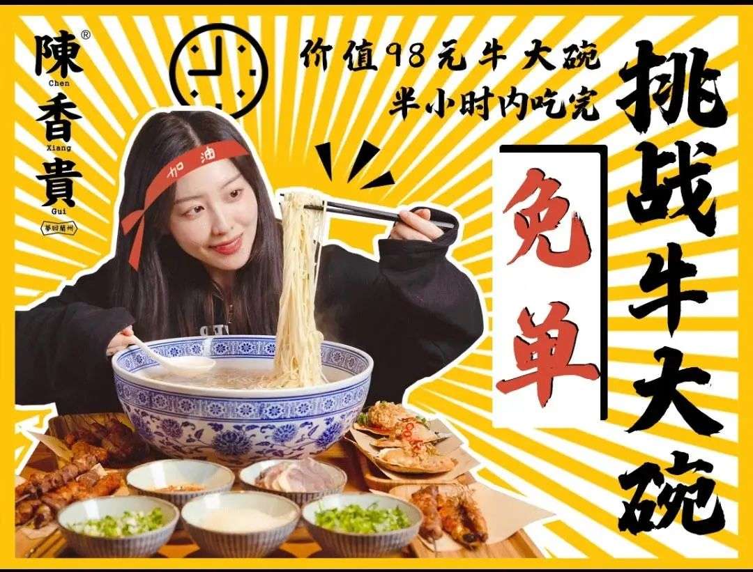 比如,陈香贵的超大碗牛肉面挑战,一度刷爆了抖音。