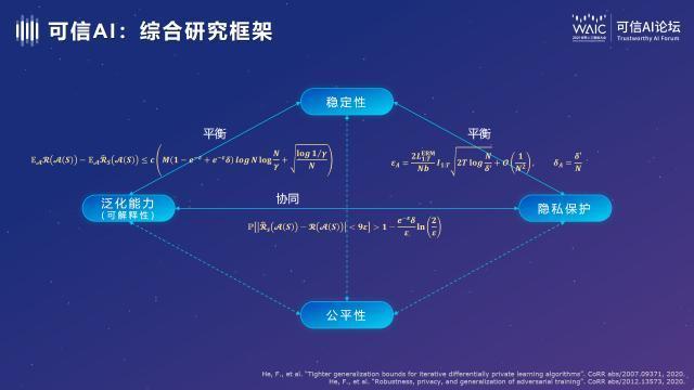 京东探索研究院院长陶大程指出,从技术角度出发,可信AI的研究可归纳为稳定性、可解释性、隐私保护及公平性四个方面。其中,稳定性指AI的抗攻击能力;可解释性指AI的泛化能力;隐私保护可借助差分隐私手段完成;而公平性则使用一系列公平决策指标进行衡量。同时,以上四个方面并不孤立,又互相联系,AI开发者应做到整体评估。