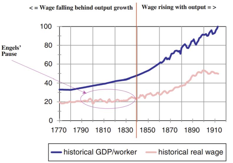 技术变革可以迅速推动经济增长,但并不能立即带来社会工资水平的提高。美国经济史学家Robert Allen (2009)研究发现,英国工业革命一经发生,人均GDP就得到大幅提升,但工资水平在长达半个世纪的时间里几乎没有增长。Allen把这种现象命名为“恩格斯停滞 (Engels’ Pause)”。直到1840年之后,英国的工资水平才开始大幅提高,从而呈现出与人均GDP同步增长的趋势。如下图所示。