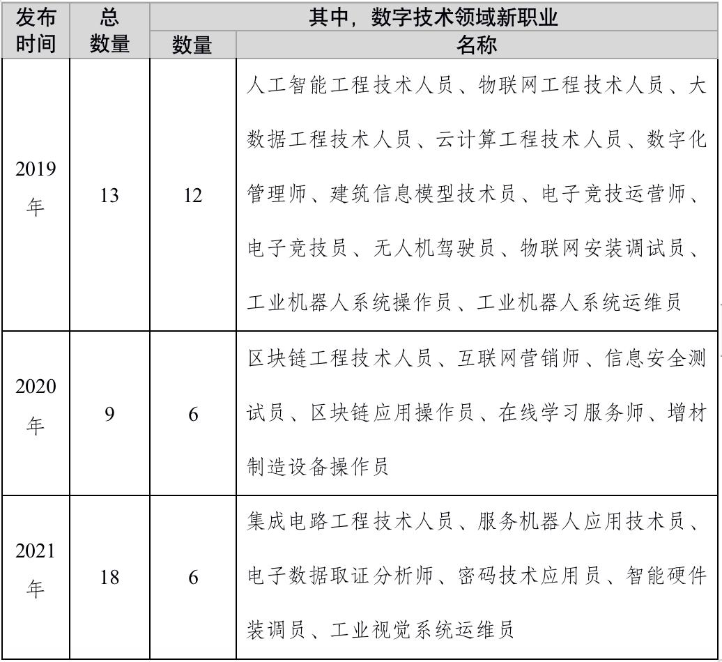 数字技术的广泛应用无疑会创造出新的职业类型,尤其是在数据分析、软件和应用程序开发、网络、人工智能、机器人和3D打印等领域。根据人力资源和社会保障部、国家市场监管总局和国家统计局联合发布的新职业信息,最近三年我国新出现的职业分别有13个、9个和18个。其中由数字技术所创造的占多数,分别为12个、6个和6个。如下表所示。