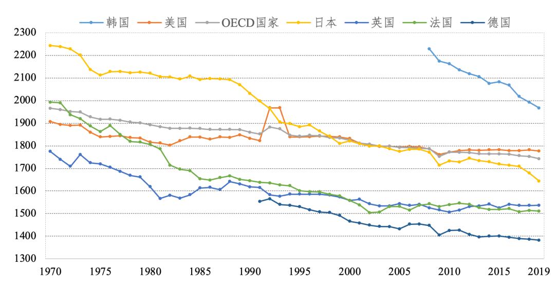 图3 OECD和部分国家的年平均工作小时数,来源:OECD
