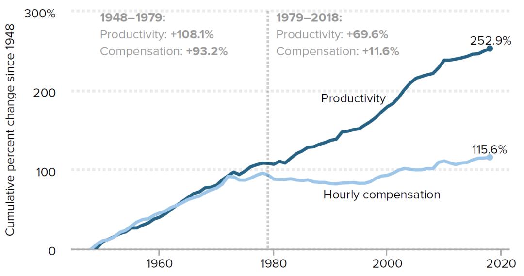 图2 1948-2018年美国生产率和时薪增长对比图来源:经济政策研究所(EPI) ,2020年2月