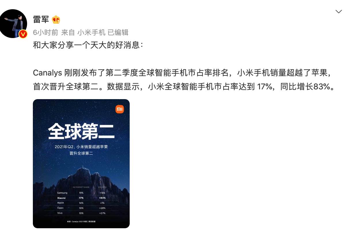 雷军凌晨发文:小米手机销量超越苹果,首次居全球第二