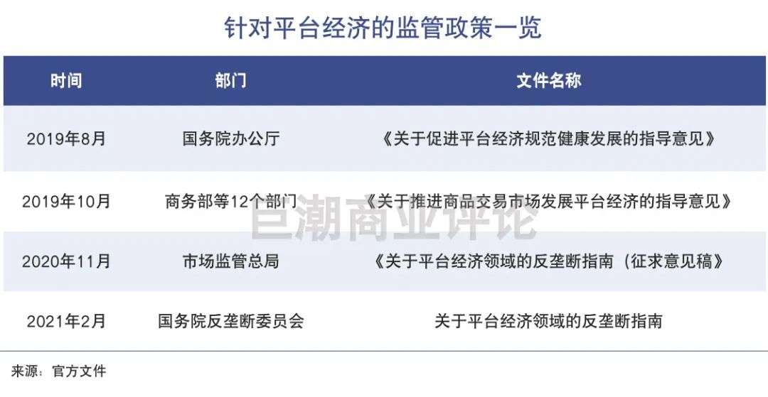 针对互联网“平台经济”的监管行动,最早可追溯到2019年下半年。2020年11月推出的《关于平台经济领域的反垄断指南(征求意见稿)》尤其引发外界关注 ,并于2021年2月正式公布。