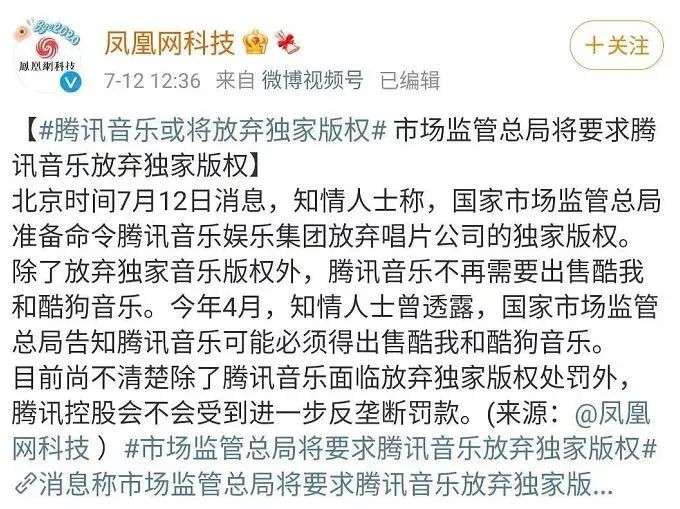 这与去年12月中央经济工作会议强调反垄断后的大环境有关。因为未正确申报收购酷狗和酷我,国家市场监管总局对腾讯音乐处以50万元罚款,而除了放弃独家音乐版权外,腾讯音乐不再需要出售酷我和酷狗音乐。