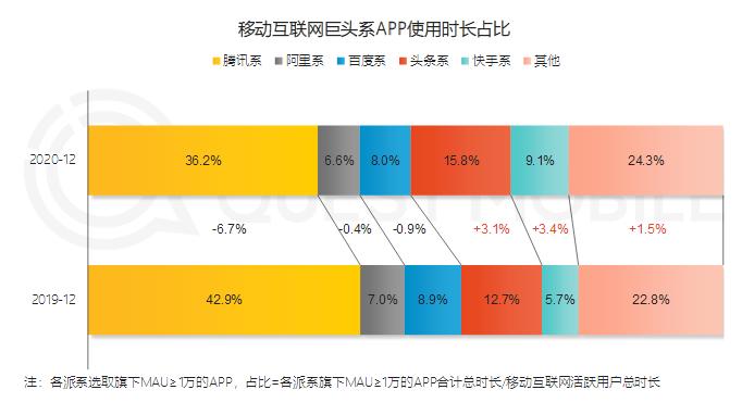 此趋势下,互联网巨头对用户时长的争夺加剧,分析2019年到2020年移动互联网巨头系APP使用时长占比变化可知,头条系及快手系“短视频+直播”产品形态抢占效果明显,阿里系、腾讯系及百度系均有所下滑。