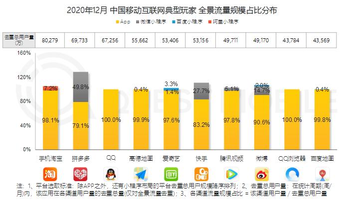 除APP外,微信小程序已经成为众多互联网平台最重要的流量入口。以拼多多为例,2020年12月,其小程序渠道用户量占去重总用户量占比高达49.8%。