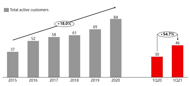 唯品会活跃用户数量(百万)数据来源:唯品会财报(截至2021年3月31日)