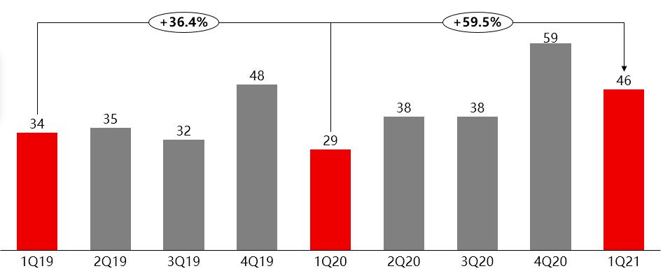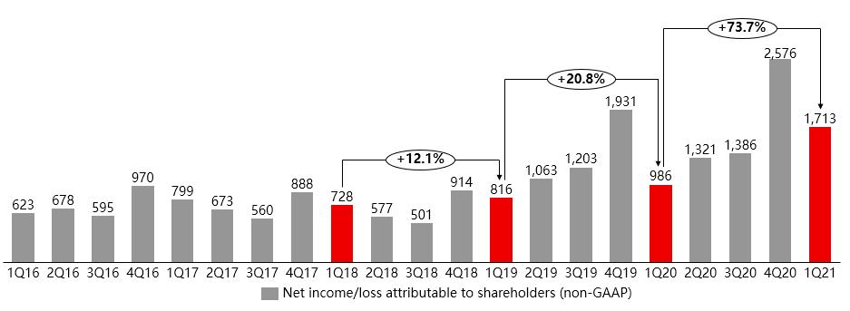 唯品会Non-GAAP净利润增长趋势 数据来源:唯品会财报(截至2021年3月31日)