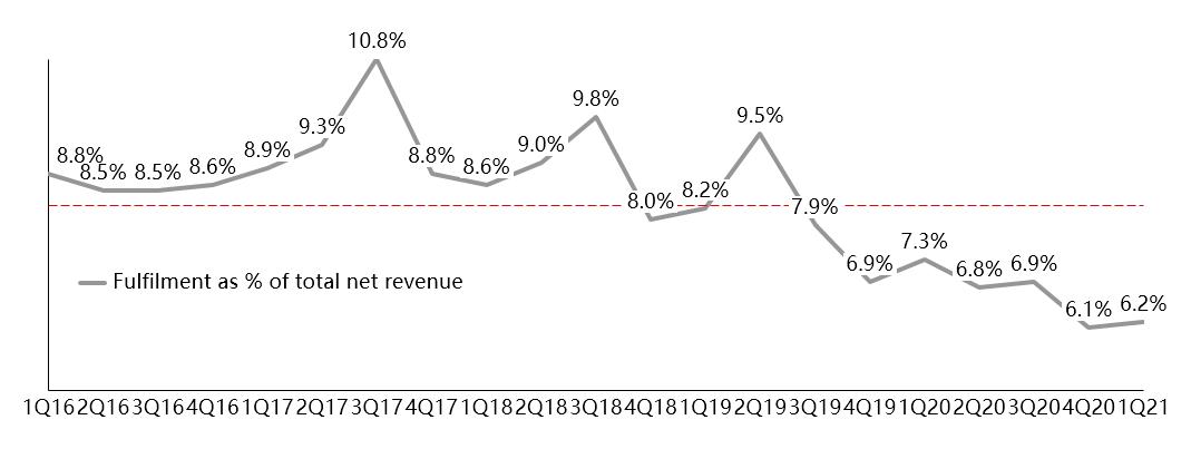 唯品会履约费用率 数据来源:唯品会财报(截至2021年3月31日)