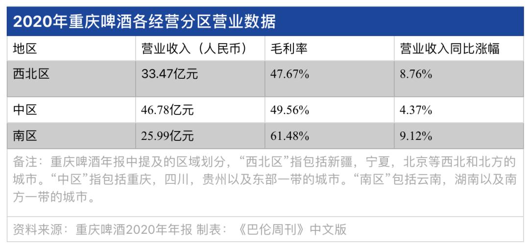 2016年至2019年,重庆啤酒的营收维持在人民币31亿元到36亿元的区间,整体增长幅度有限。在完成与嘉士伯的重大资产重组后,2020年,重庆啤酒的营收首次突破100亿元大关。以营收计算,在中国市场,重庆啤酒行业排位已经仅次于百威亚太、华润啤酒和青岛啤酒。