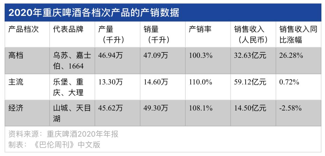 公司年报称,2020年,在中国啤酒总产量同比下降7.04%的背景下,重庆啤酒营业总收入同比增长7.14%,销量同比增长3.30%,实现归属于上市公司股东的净利润同比增长3.26%。