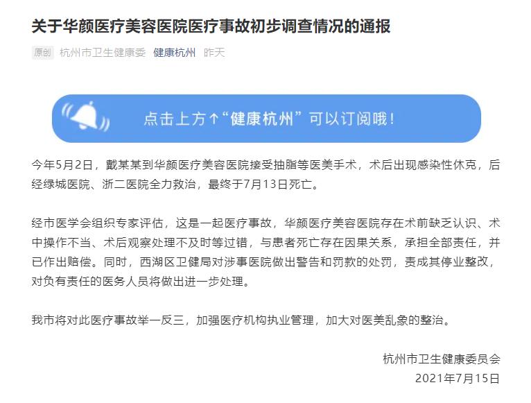 最新一起轰动案例是,33岁杭州女子网红小冉因抽脂感染医治无效去世,引发网友热议。官方通报称,根据专家评估,华颜医疗美容医院存在术前缺乏认识、术中操作不当、术后观察处理不及时等过错,与小冉死亡存在因果关系,承担全部责任。