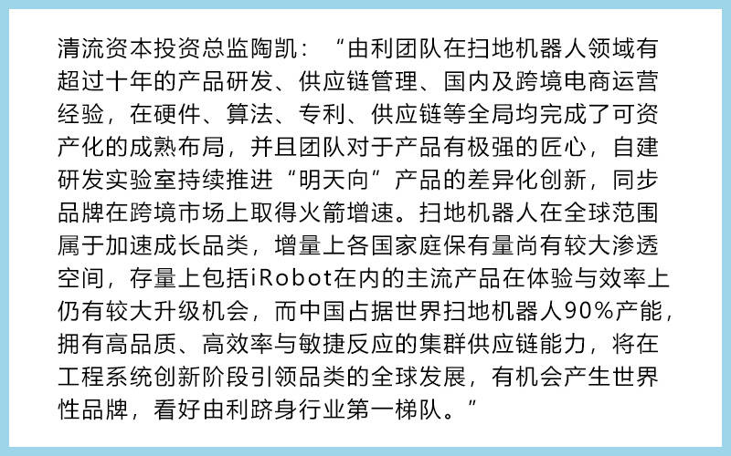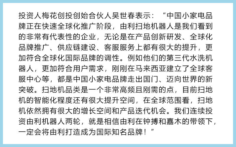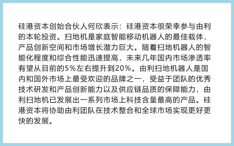 36氪获悉,智能家庭清洁机器人品牌商由利(深圳)科技有限公司(以下简称由利科技)已于2021年上半年完成5000万元A轮融资,本轮投资方为梅花创投,清流资本,硅港资本,星涵资本担任长期独家财务顾问,资金将主要用于跨境业务的完善,以及新产品研发投入。
