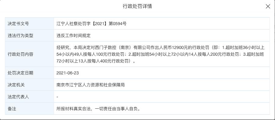 2021年,西门子数控(南京)有限公司因加班问题被有关部门行政处罚,成为了近期因加班被罚款的第一人。在通告中。南京市江宁区有关部门因西门子数控违反了工作时间规定,「76人超时加班」,对其处1.29万元的行政处罚。