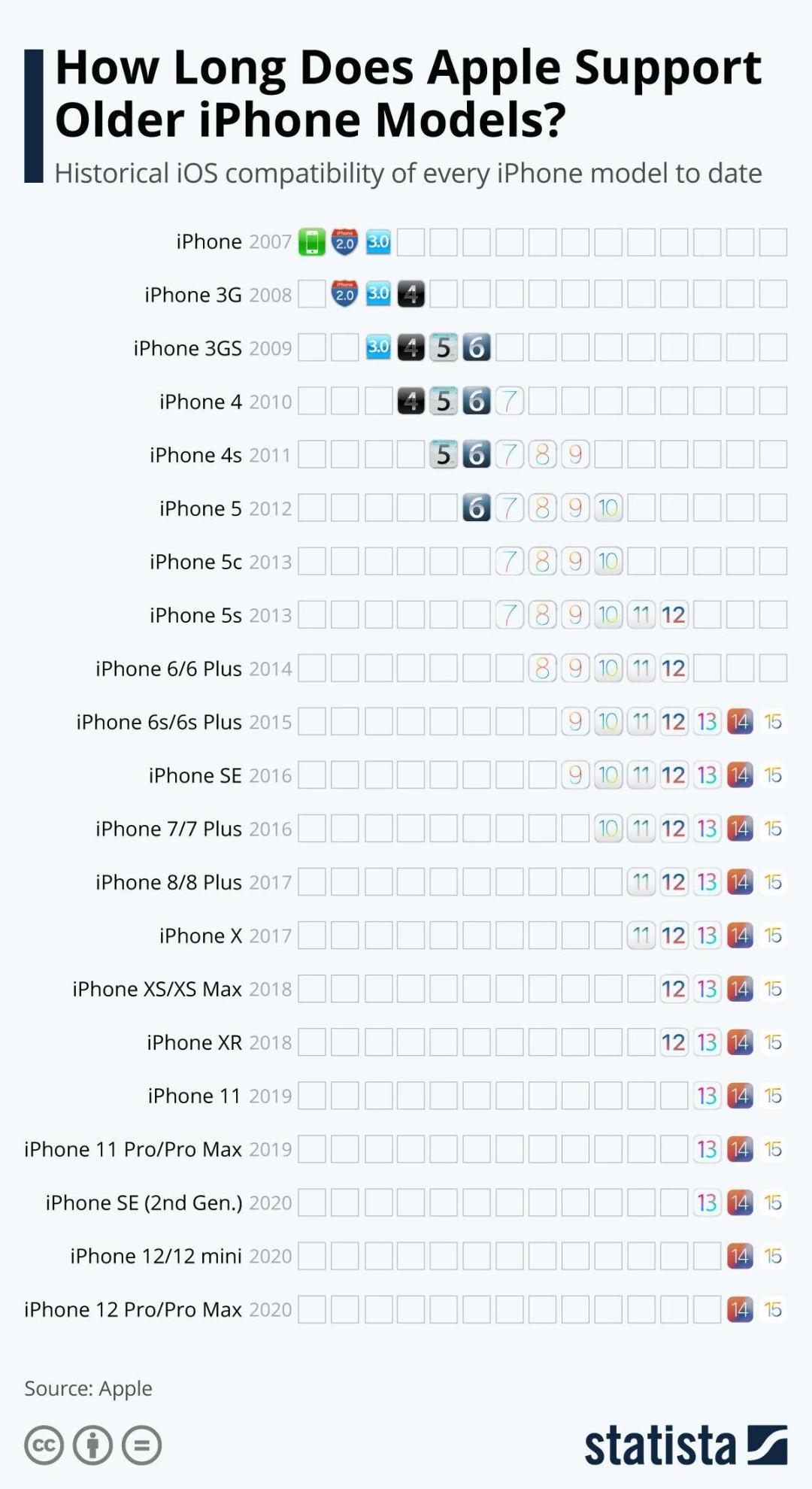 iPhone 一直保有良好的软件更新传统。据 Statista 的统计,自 iPhone 4s 开始,几乎每一代 iPhone 都能享有至少 5 年软件更新支持,iPhone 6s、6s Plus 享受的系统版本更新数量最多。