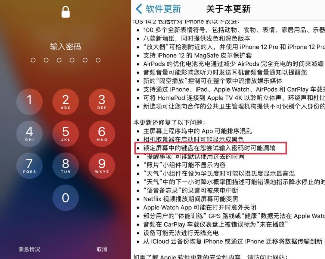 比较耐人寻味的还有锁屏漏输密码的问题,直到一年之后的 iOS 14.2 上才得到了解决,不知有多少人怀疑了一年“是不是自己手有问题”。