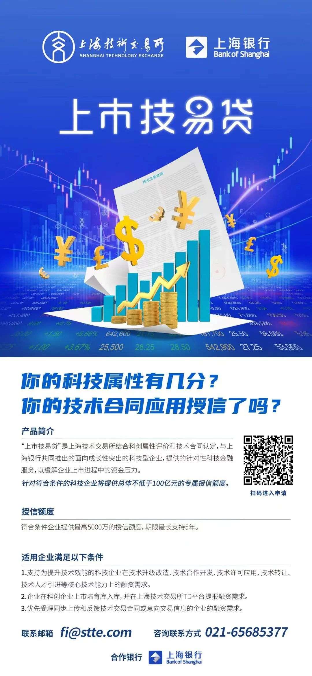 上海技术交易所联合上海银行开发的科创企业专属金融产品——“上市技易贷”将于近日正式推出。该产品设立了100亿元专项授信额度,为具有科技成长性、先进突破性的科技型企业提供专属金融服务,支持技术交易转化进场和科技企业培育上市,服务上海科创中心建设。