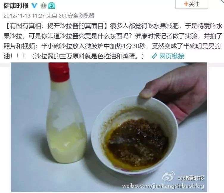 微波炉加热后油脂分离的蛋黄酱 | 微博截图