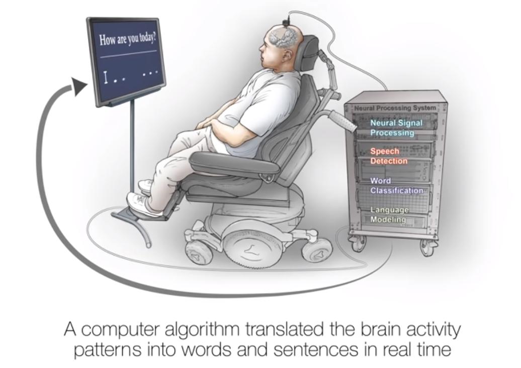 在实验中,研究者在其大脑的感觉运动皮层(sensorimotor cortex)区域植入一个硬膜下、高密度的多电极阵列,用于控制受试者的言语。