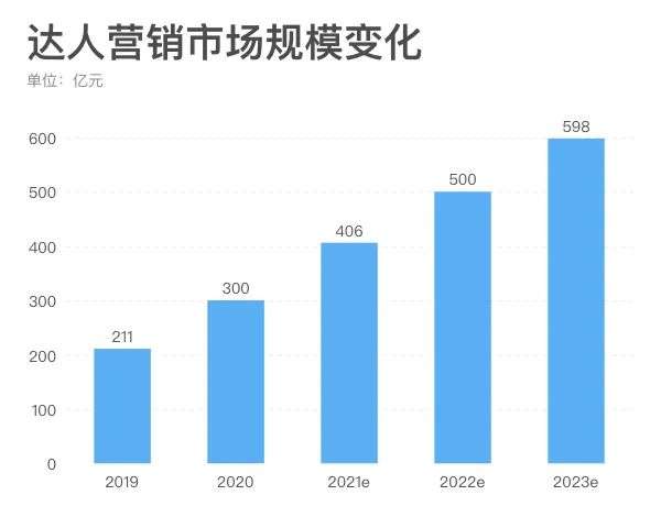 据预估,随后三年的达人营销市场规模还将分别增长至406亿元、500亿元和598亿元,复合年增率接近30%,是一个基数不小且仍在快速增长的市场。