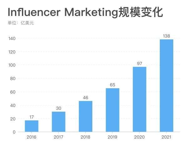 InfluencerMarketingHub发布的一份报告显示,影响者营销市场规模将从2016年的17亿美元增长至2021年的138亿美元。仅在2019年,就有超过240家专注影响者营销的新服务商和新平台成立。