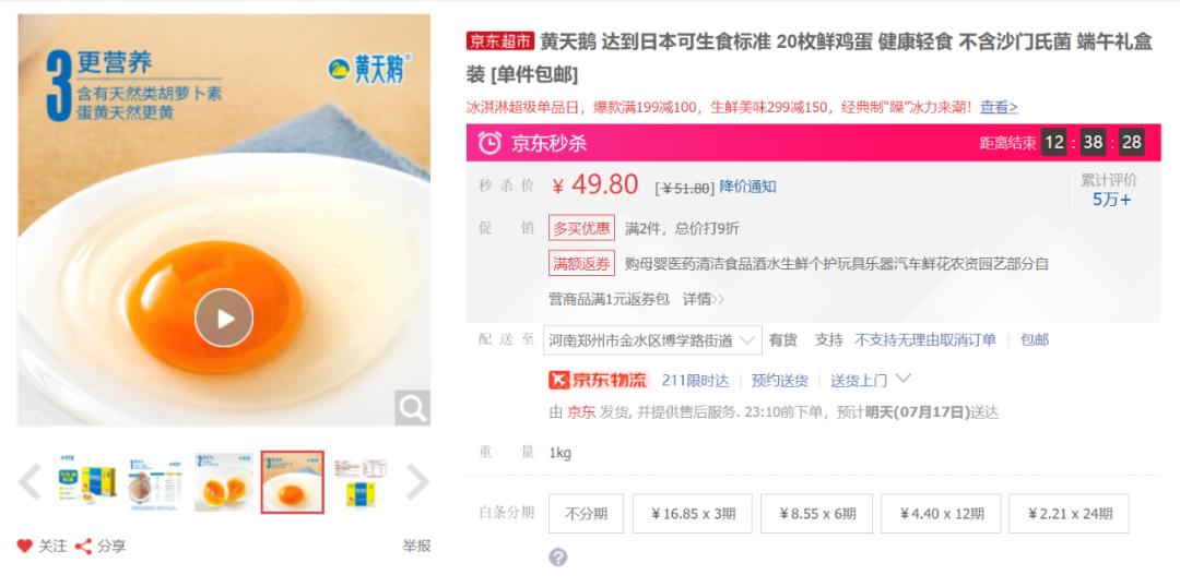 据悉,“可生食鸡蛋”品牌黄天鹅20枚鸡蛋在电商平台已经卖到了50元左右,平均一枚鸡蛋的价格为两块五毛钱,已达国内鸡蛋平均价格的四倍之多。