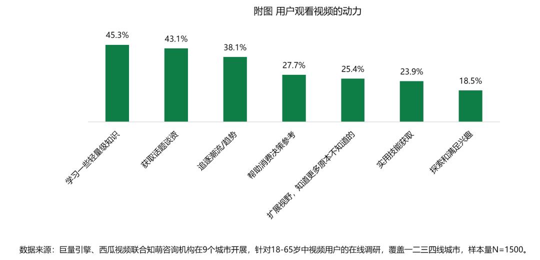 受众观看中视频的动机包括:获取轻量级知识、获取话题谈资、追逐潮流/趋势,帮助消费决策参考以及拓展视野等,这也意味着中视频成为人们内容新消费的选择。