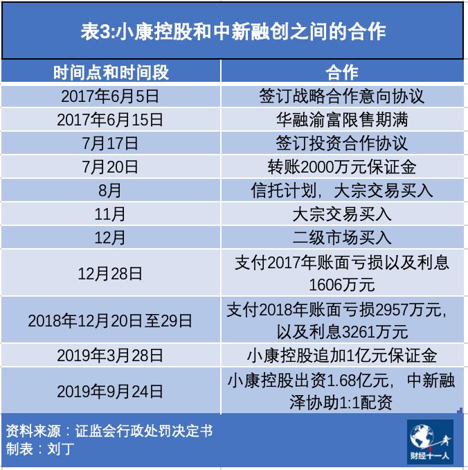 根据证监会2021年4月13日的《行政处罚决定书》,2017年6月到7月,小康控股与中新融创资本管理有限公司(下称中新融创)达成协议。小康控股提供2000万元保证金,委托中新融创出资约6.3亿元,成立6个信托计划,购买小康股份的股票。