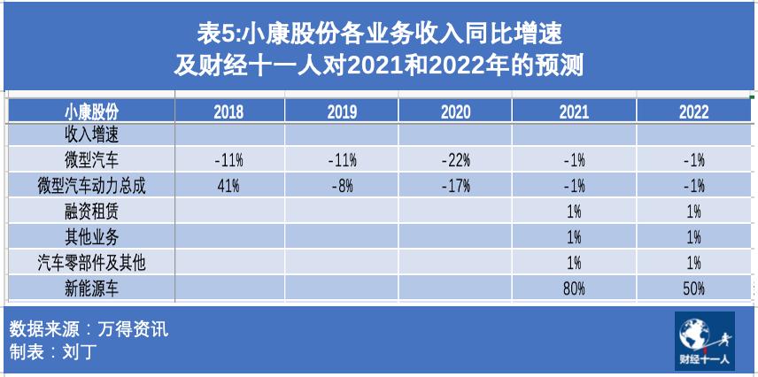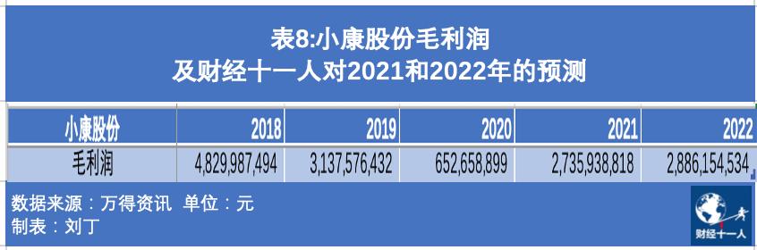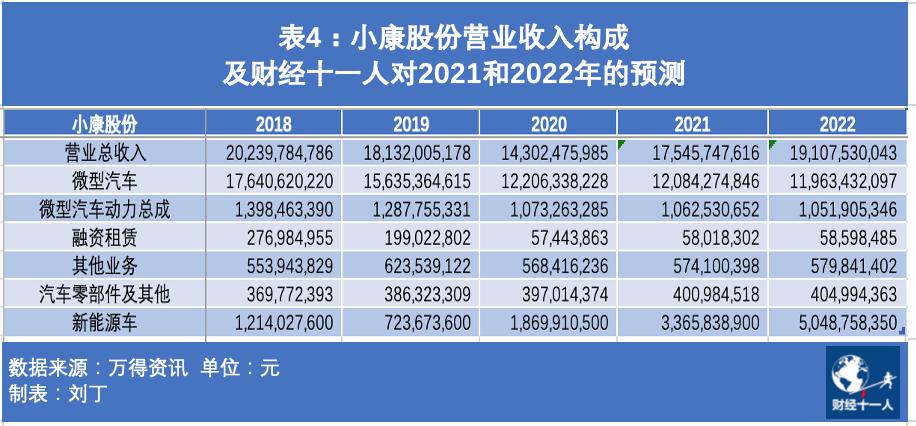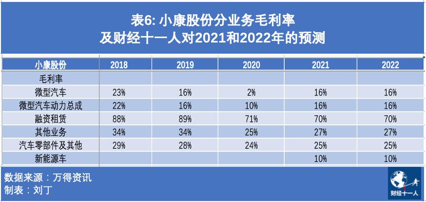 财经十一人根据小康股份年报披露的按项目划分的主营构成,对各个项目进行拆分,并结合财经十一人对于行业景气度及公司产品的判断,对各项目2021年和2022年的业务增速、毛利率进行假设,并测算出其毛利润。