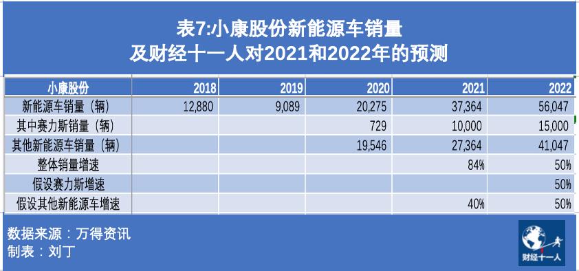根据财经十一人的盈利预测模型,2021年和2022年,小康股份的赛力斯销量达到1万辆,1.5万辆,新能源车总销量达到3.7万辆和5.6万辆(即新能源车销量同比增长80%和50%),新能源车毛利率达到10%,燃油汽车和动力总成的收入同比增速两年均为-1%,燃油汽车毛利率恢复到2019年的16%的水平。