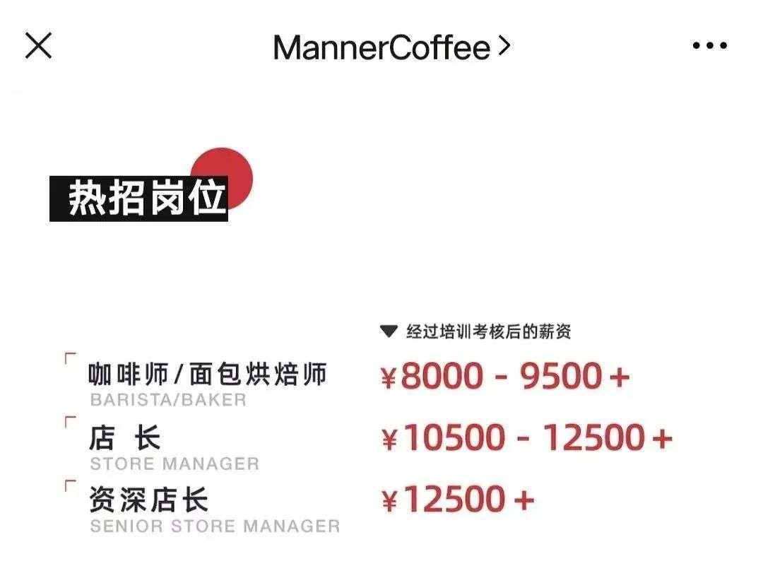 根据36氪报道称,Manner为此在人员培训上花了很大价钱,咖啡师开的工资也不低,要比普通的咖啡店开的高1000-2000元。“Manner的小白咖啡师月薪5000元左右,熟手7000元-8000元,店长1万。”Manner前员工曾告诉媒体。不仅给员工开高价,Manner有时还会与咖啡师签订竞业协议,要求对方在离开后一年内不能在咖啡行业任职。此前,咖啡行业没有竞业协议一说。