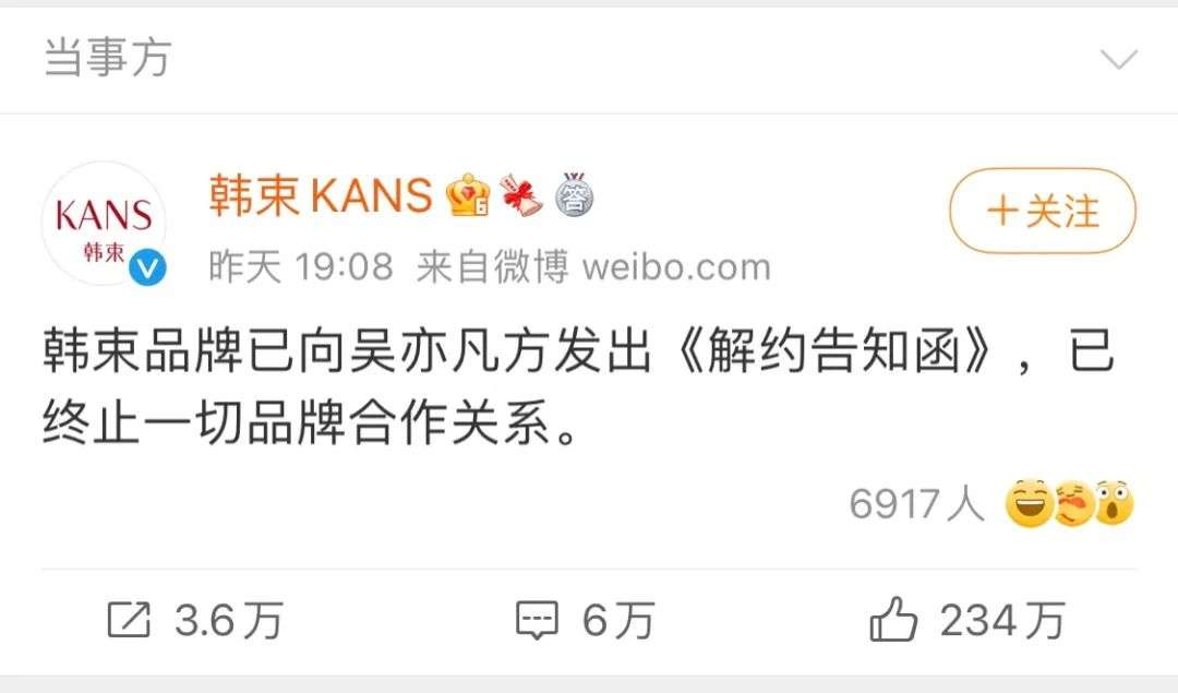 韩束、立白、滋源、康师傅冰红茶以及腾讯视频等众多品牌,纷纷宣布与吴亦凡终止合作关系;兰蔻、良品铺子等已经与吴亦凡合约到期的品牌也纷纷发声,和吴亦凡撇清关系。